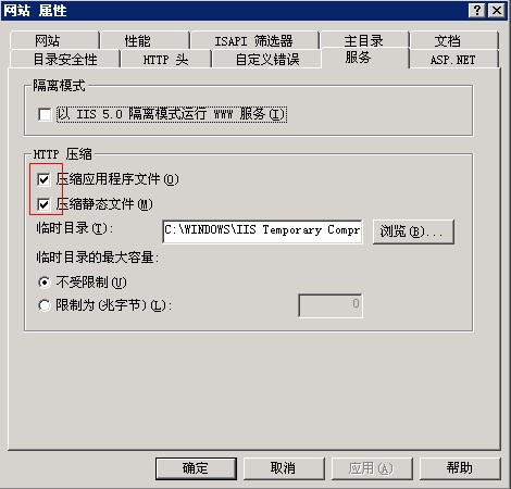 壓縮后的緩存文件會存放在C:\WINDOWS\IIS Temporary Compressed Files 因此建議在IIS--網(wǎng)站--屬性--服務,設(shè)置一個大小,避免C盤被占滿了。如圖:
