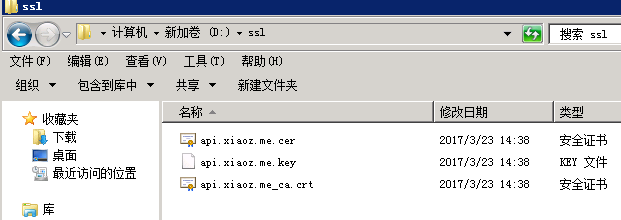 • 將我司申請的ssl證書放到任意目錄,比如我放到D:\ssl這個目錄,一般有3個文件