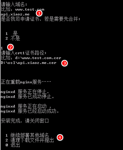 • 再次運行win-ssl.bat這個腳本,輸入建站助手上綁定的域名api.xiaoz.me